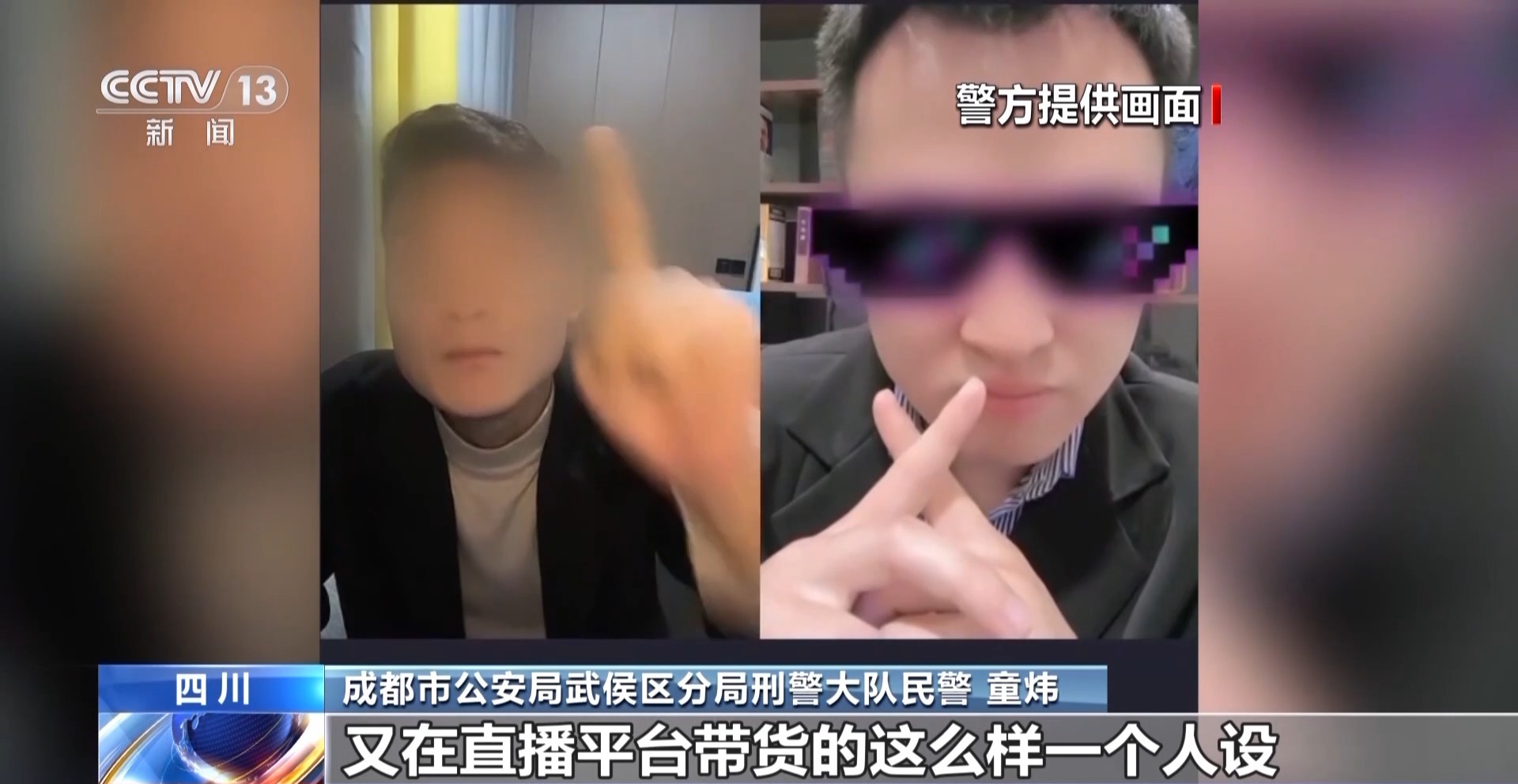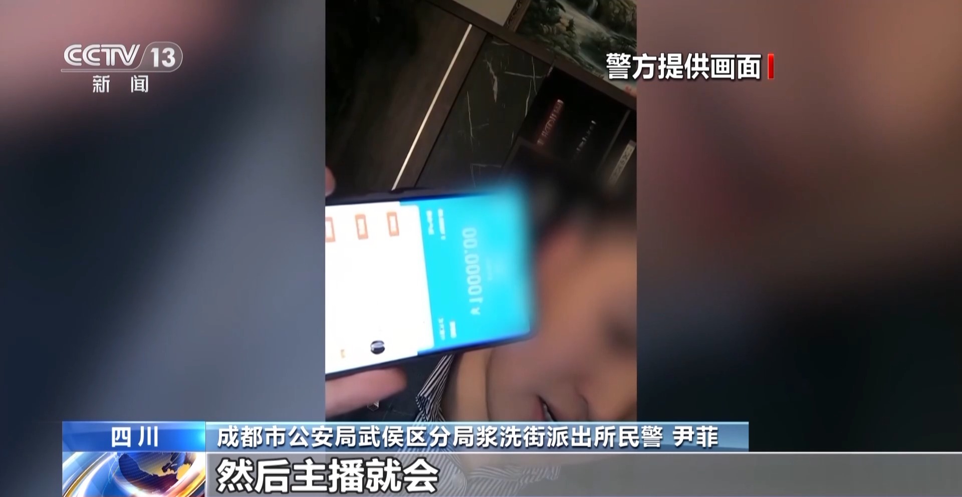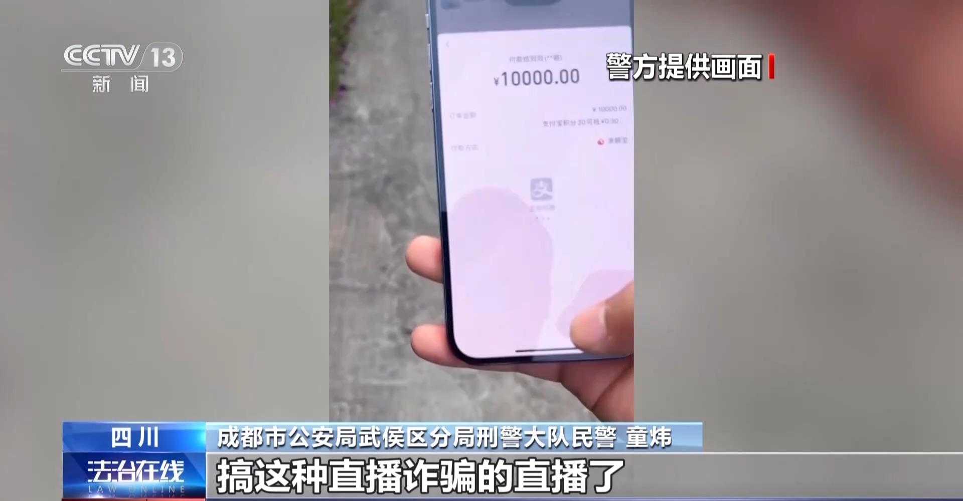 成都市公安局武侯区分局刑警大队民警 童炜:他有的直播是一个老板,员工有一两百个人;有的视频他又变成了在直播平台带货的人设。每个视频里他最先开始都会连麦一个粉丝,每次粉丝都会收到“支付宝到账一万元”的录音。因此我们初步判定连麦粉丝应该和他是一伙的。