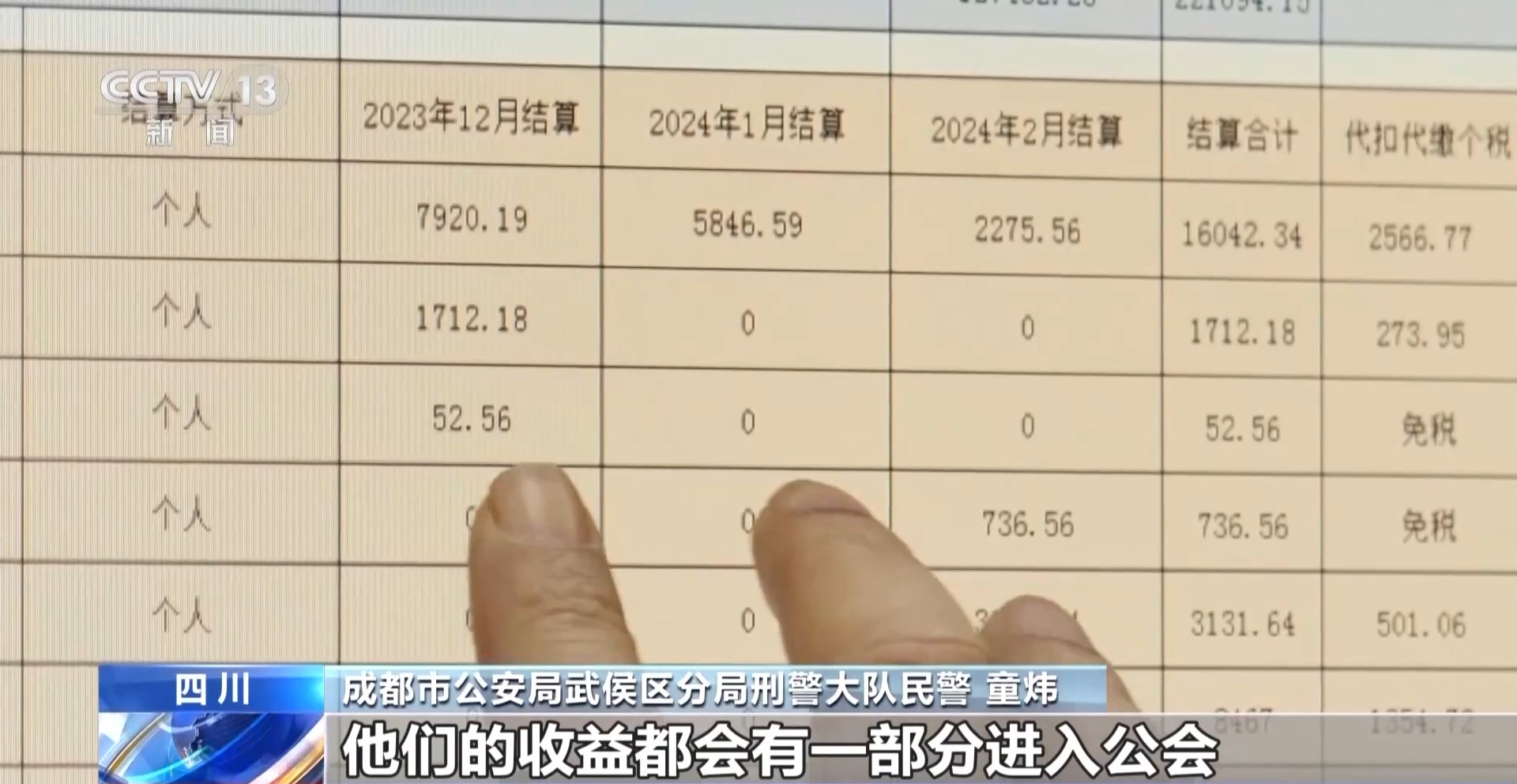 成都市公安局武侯区分局刑警大队民警 童炜:通过我们从平台调取的数据发现,这些主播都在一个公会。公会里面所有人部分的直播收益都会进入公会。于是我们调取了公会的注册信息,发现这些主播都在四川见正传媒有限公司注册的公会中。